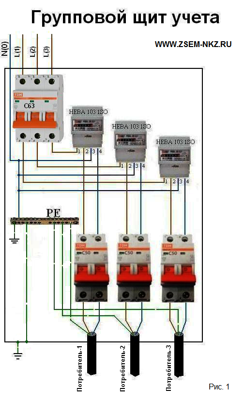Считаю использование групповых щитов учета (далее ГЩУ) более рациональным и доступным российским потребителям электрической энергии в таких сельских поселениях. В такой щит учета ГЩУ можно монтировать любое количество счетчиков электрических типа НЕВА 103 1SO, НЕВА 102 1SO, СКАТ 101М/1-3 Ш Р1, АРБИТР-М и т. д. . Схема группового щита учета на рис. 1